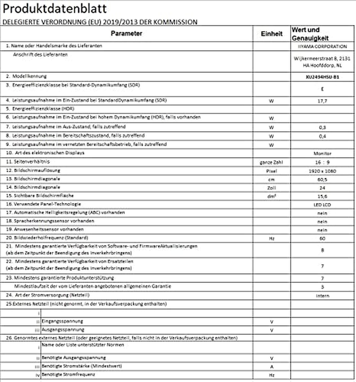 Monitor IIYAMA XU2494HSU-B1 nabízí skvělý zážitek ze sledování díky své úhlopříčce 60,5 cm a poměru obrazovky 16:9. Díky energetické třídě E je tento monitor s technologií panelu LED_LCD ekologický a výkonný. Má viditelnou plochu 15,6 palce a podporuje působivé rozlišení 1920 x 1080 pixelů, které poskytuje ostrý obraz v úžasných barvách. Za zmínku stojí funkce pro úsporu energie tohoto modelu, včetně pohotovostního režimu s nízkou spotřebou s příkonem pouhých 0,4 wattu, díky čemuž je ideální pro ty, kteří chtějí být ohleduplní k životnímu prostředí a přitom mít nejnovější technické vychytávky. Jeho elegantní design ve spojení s ochrannou známkou IIYAMA zajišťuje, že tento produkt bude spolehlivý a dlouhotrvající s garantovanou podporou po dobu až sedmi let. Datum zahájení prodeje bylo 20. srpna 2021, takže si můžete být jisti, že získáváte jeden z nejnovějších produktů dostupných od IIYAMA. Se vším