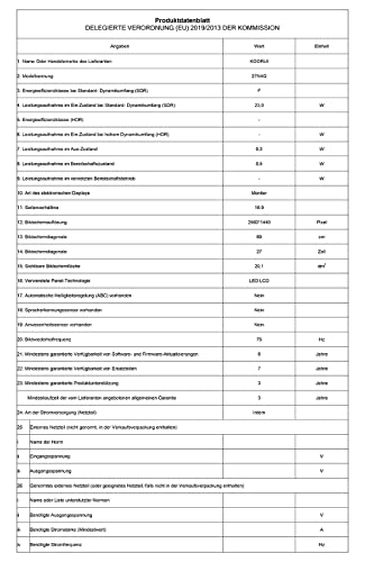 Představujeme monitor KOORUI 27N4Q s elegantním a moderním designem s úhlopříčkou 69 cm. S poměrem stran 16:9 je tento LED_LCD monitor ideální pro streamování vašich oblíbených pořadů nebo hraní her. Třída energetické účinnosti je ohodnocena F, což zajišťuje, že si můžete užívat hodiny zábavy bez obav z vysokých účtů za elektřinu. Rozlišení obrazovky se může pochlubit ostrými 1440 vertikálními pixely a 2560 horizontálními pixely, které poskytují ohromující vizuální efekty, které jistě zapůsobí. Díky frekvenci 75 Hz můžete očekávat plynulý a bezproblémový pohyb při hraní her nebo sledování rychlých filmů. Tento model obsahuje režimy pro úsporu energie, jako je režim vypnutí s pouze 0,3 wattu a pohotovostní režim s pouze 0,5 wattu, takže můžete šetřit energii, když se nepoužívá, aniž byste museli obětovat kvalitu výkonu. Nakupujte s jistotou s vědomím, že je zaručena podpora po dobu tří let od zapnutí - datum zahájení trhu 30. října 2021 u produktů s ochrannou známkou KOORUI!