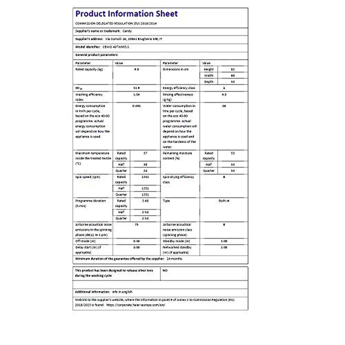 Představujeme Candy CBWO 49TWME/1-S, elegantní a efektivní vestavěnou pračku prádla. S hlučností pouhých 75 decibelů nebude tento stroj rušit vaši domácnost. Jeho působivá míra odvodu vlhkosti 53,9 % zajišťuje, že vaše oblečení bude sušší než kdy předtím. Díky třídě odstřeďování B a jmenovité kapacitě 9 je ideální pro velké náplně a odolné skvrny. Energetická účinnost A znamená, že můžete prát bez obav z vysokých účtů za elektřinu. Tato pračka se také může pochlubit funkcí odloženého startu pro větší pohodlí a také zárukou trvání 24 měsíců od důvěryhodného dodavatele Candy. Už nečekejte a upgradujte svou praní s CBWO 49TWME/1-S!