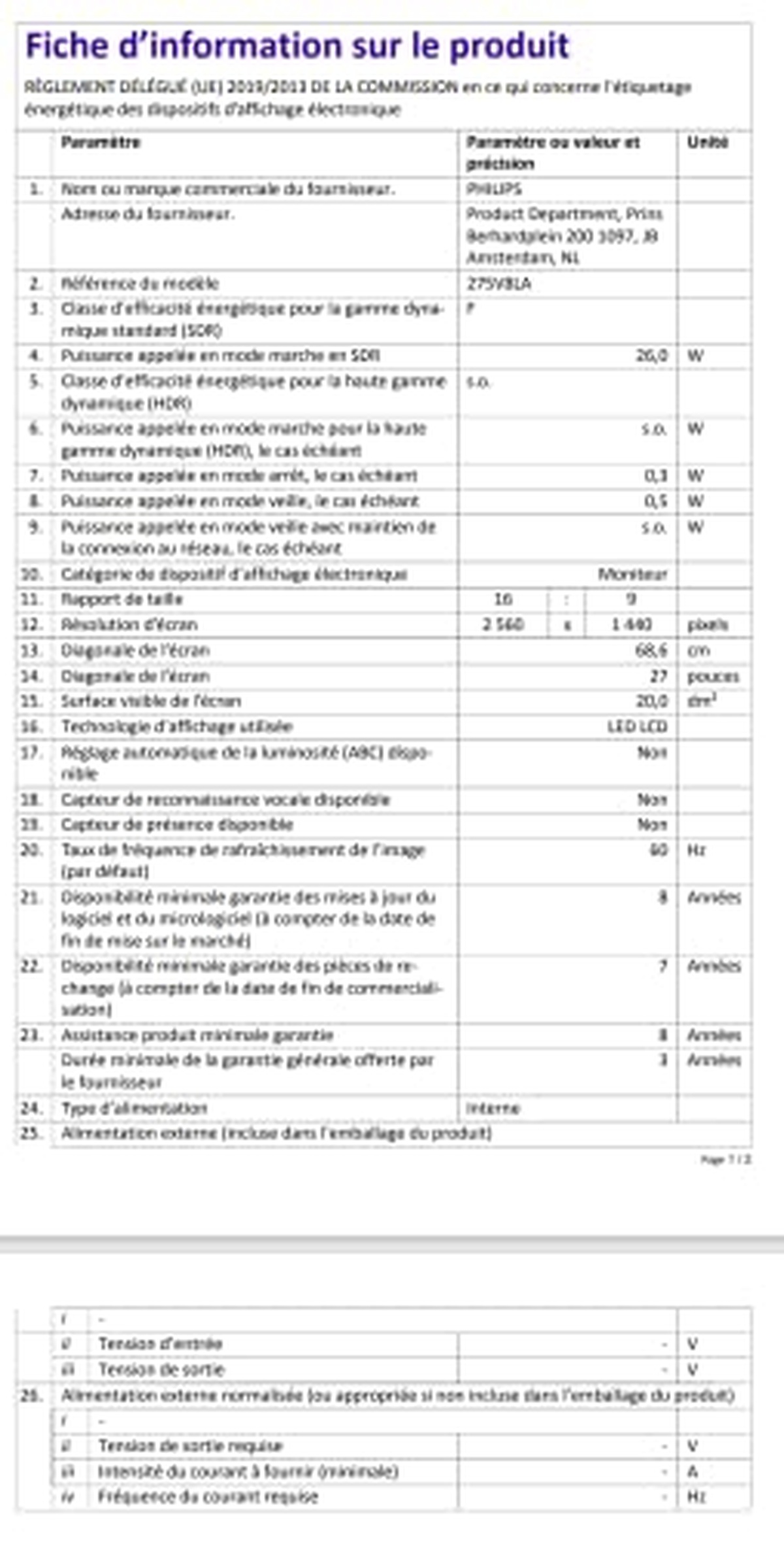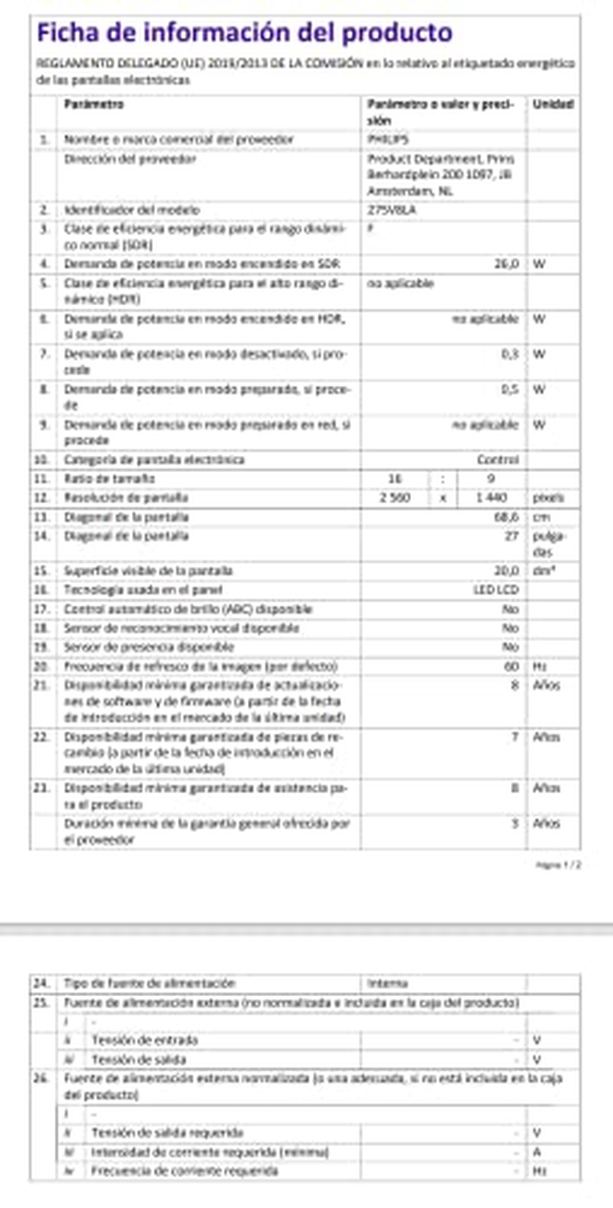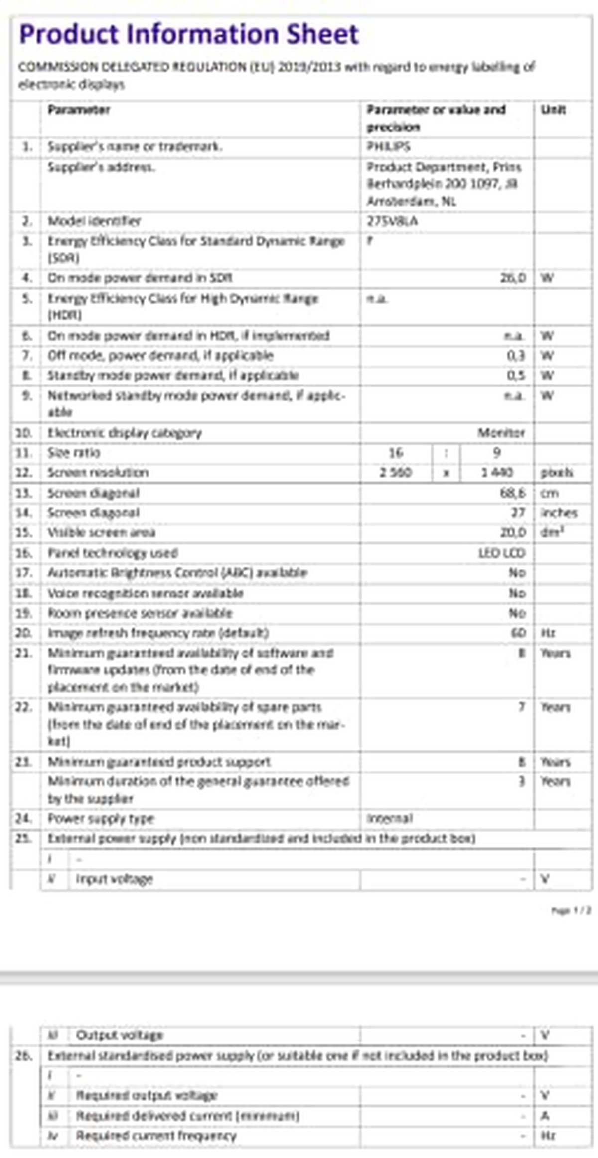 Die geschätzten Betriebskosten für das erste Jahr des PHILIPS 275V8LA-Monitors betragen €22.54 für 1000, Brussels, BRU.