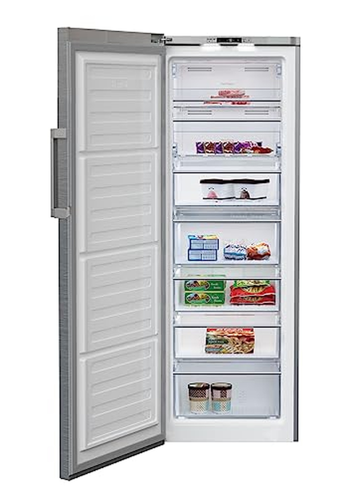 The Beko RFNE290T45XPN freezer is a sleek and spacious appliance that is perfect for storing all your frozen goods. With a total capacity of 290 liters, this freezer has plenty of room to store everything from meats and vegetables to ice cream and leftovers. The frost-free design means you'll never have to worry about defrosting, while the energy-efficient performance helps save on electricity bills. The reversible door makes it easy to place this freezer in any corner of your kitchen, while the fast freeze function ensures quick and efficient freezing of new items. Overall, the Beko RFNE290T45XPN is a reliable and convenient addition to any home kitchen.