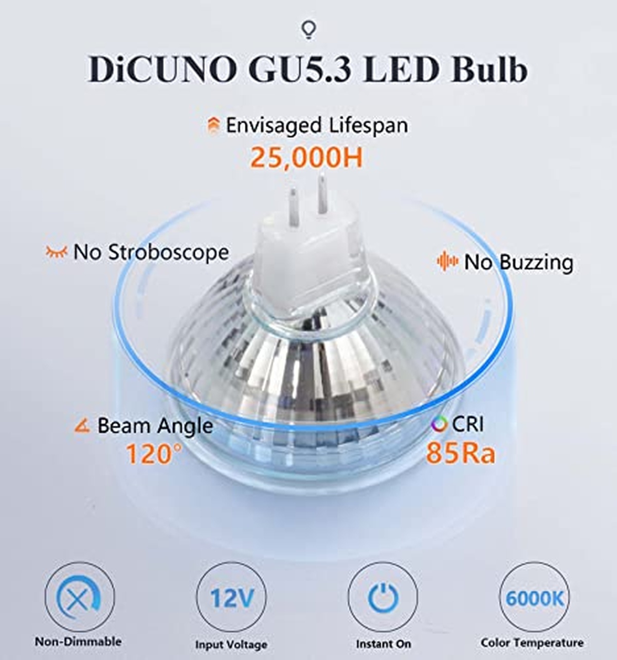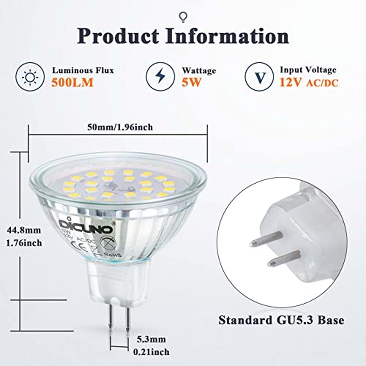 DiCUNO 12V-MR16-GU5.3-24-GLS-DW LED light bulb is a high-quality GU5.3 5W bulb that emits a bright 500lm of light. This energy-efficient bulb is perfect for illuminating any space with its cool white glow. Easy to install and long-lasting, this DiCUNO light bulb is a great choice for any lighting application.