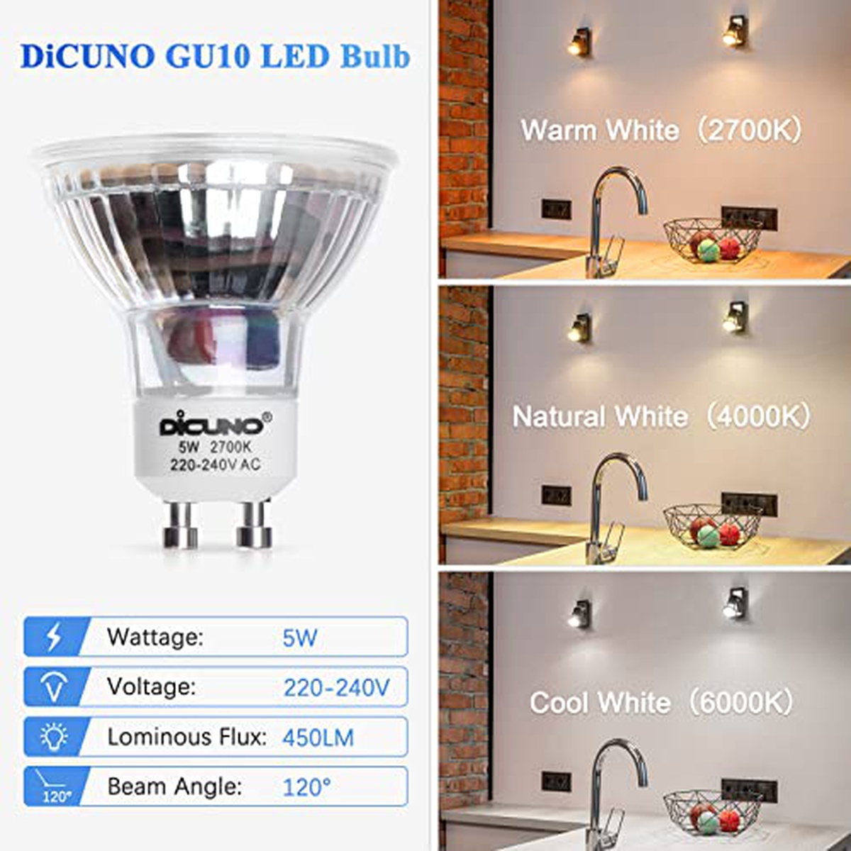 The DiCUNO GU10-24-GLS-WW LED GU10 5W 450lm light bulbs are an exceptional choice for illuminating your space. With a power output of 5 watts, these light bulbs offer a perfect balance between brightness and energy efficiency. Emitting a luminous flux of 450 lumens, they provide ample lighting to brighten up any room. Designed with the GU10 base, these light bulbs can easily be installed in compatible fixtures without any hassle. The warm white color temperature adds a cozy ambiance to your surroundings, making them ideal for relaxing evenings or creating a welcoming atmosphere. Crafted with high-quality materials and advanced technology, these LEDs ensure excellent durability and longevity. You can expect them to last for thousands of hours while maintaining their superior performance throughout their lifespan. Whether you need to illuminate your living room, bedroom, or workspace, the DiCUNO GU10-24-GLS-WW LED GU10 5W 450lm light bulbs are the perfect lighting solution. They combine reliability, energy efficiency, and aesthetics into one versatile package that will enhance any environment.