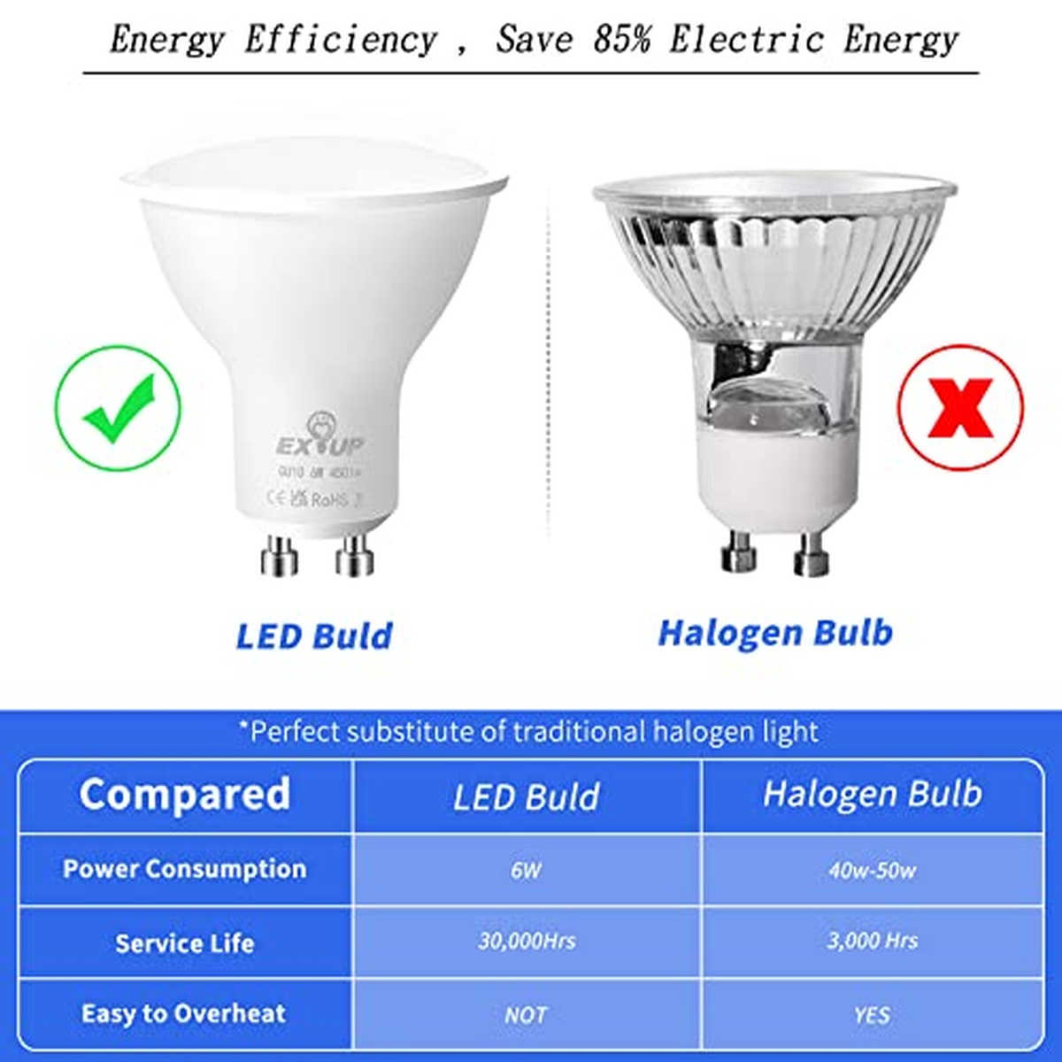 The EX UP GU10 LED GU10 5W 330lm light bulb is a high-quality lighting solution that combines efficiency and brightness. With its sleek design and compact size, this light bulb is perfect for any indoor setting. It features advanced LED technology, providing an impressive luminous output of 330 lumens while consuming only 5 watts of power. The EX UP GU10 LED GU10 5W 330lm boasts exceptional durability and longevity, ensuring long-lasting performance without compromising on quality. Its attributes include excellent heat dissipation, allowing for safe operation even during extended periods of use. Additionally, it offers a wide beam angle to evenly distribute the light and illuminate larger areas effectively. This versatile light bulb fits seamlessly into standard GU10 sockets, making installation quick and effortless. Whether you need ambient lighting in your living room or focused task lighting in your kitchen or office space, the EX UP GU10 LED GU10 5W 330lm provides reliable illumination with minimal energy consumption. Experience the brilliance of this outstanding light bulb as it effortlessly brightens up your surroundings with its warm yet vibrant glow. Say goodbye to traditional incandescent bulbs and embrace the future of lighting technology with the EX UP GU10 LED GU10 5W 330lm – where efficiency meets style!