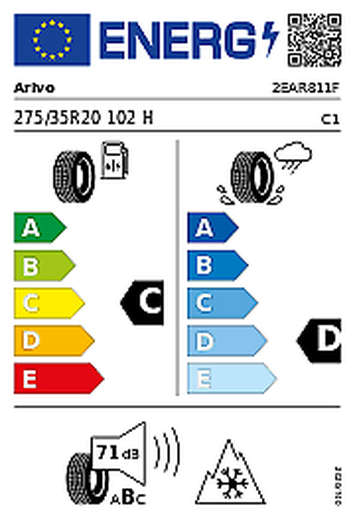 The ARIVO Winmaster ProX ARW5 275/35 R20 102H is a high-performance passenger car tyre designed for ultimate traction and control on various road surfaces. With its advanced technology and superior construction, this tyre ensures exceptional performance in both wet and dry conditions. Featuring a width of 275mm and a diameter of 20 inches, the Winmaster ProX ARW5 provides excellent stability and precise handling. Its load-capacity index of 102 makes it suitable for carrying heavy loads without compromising safety or comfort. This tyre boasts a fuel efficiency class of 'C', promoting eco-friendly driving while maintaining optimal performance. Additionally, its external rolling noise class is rated as 'B', indicating reduced noise emissions during operation. The noise level measures at approximately 71 decibels, providing a quiet and comfortable ride. With superb wet grip capabilities classified under grade 'D', the Winmaster ProX ARW5 ensures reliable braking and cornering even on slippery roads. This makes it an ideal choice for drivers who prioritize safety in adverse weather conditions. The tyre's model number is identified as '2EAR811' under the brand name ARIVO. It was introduced to the market on May 1st, 2021, offering cutting-edge technology to enhance overall driving experience. In addition to its impressive features, this tyre also meets the requirements for severe snow conditions due to its specialized design elements. Whether facing icy or snowy terrains, this tyre guarantees enhanced traction and control for maximum safety. Overall, the Passenger car tyres ARIVO Winmaster ProX ARW5 275/35 R20 102H deliver outstanding performance across various parameters such as fuel efficiency, wet grip capabilities, noise reduction properties while ensuring durability and reliability on all types of road surfaces.