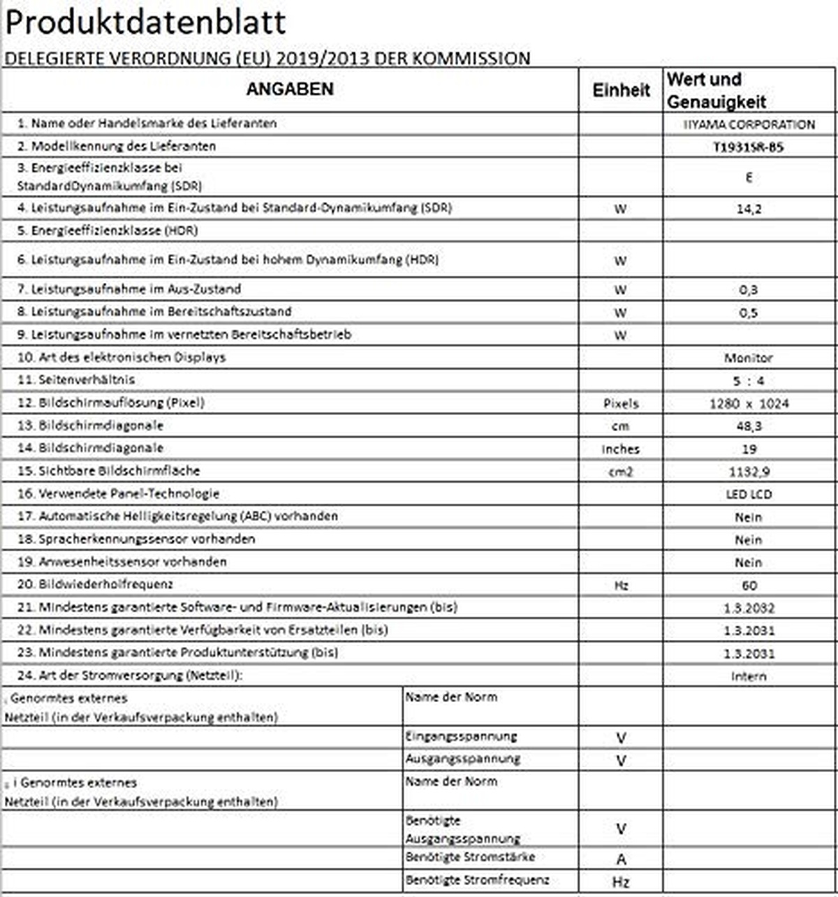 The IIYAMA T1931SR-B5 monitor boasts a spacious 48.2cm diagonal display with a 5:4 size ratio that provides an expansive visible area of 1132.9 square centimeters. With an energy efficiency rating of E, this LED_LCD panel technology monitor consumes only 0.3 watts in power off mode and 0.5 watts on standby while delivering stunning visuals at a refresh rate of up to 60Hz on its crystal-clear resolution of 1280 x1024 pixels. The T1931SR-B5 is built for longevity, offering a minimum guaranteed guarantee of three years and seven years support from IIYAMA, making it the perfect choice for demanding business environments or home users looking for advanced functionality and reliable performance alike!
