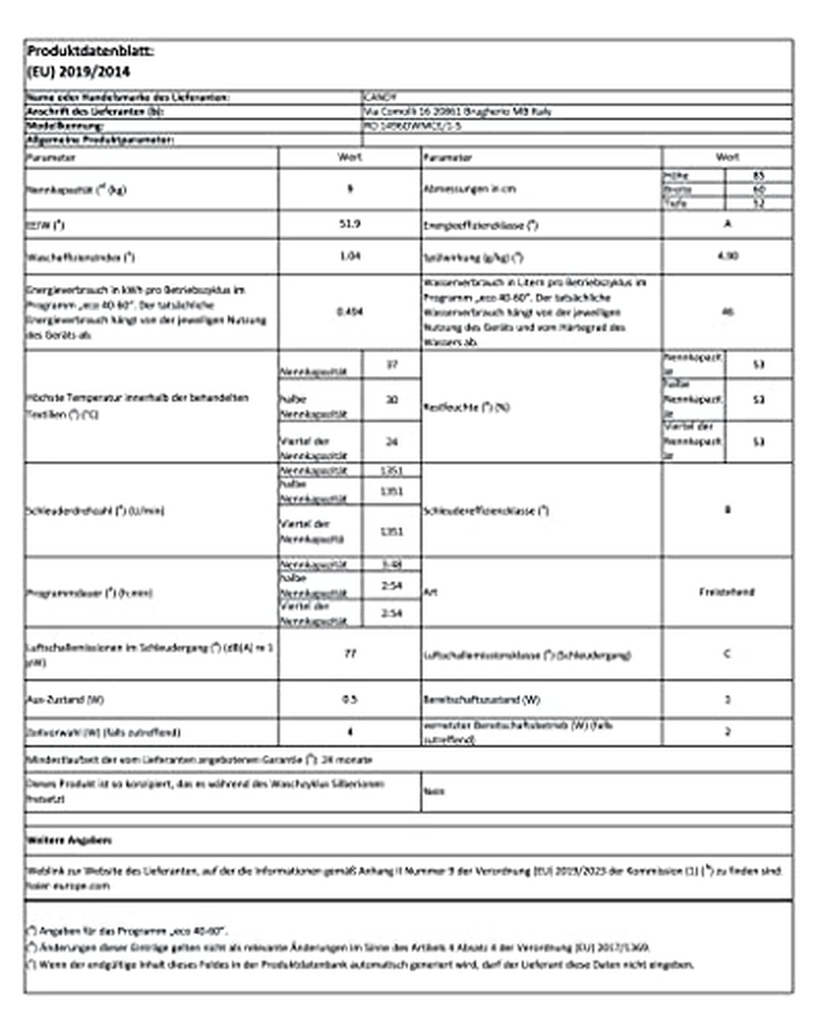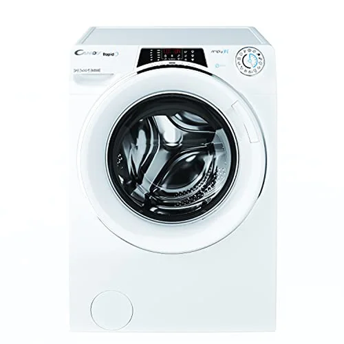 Introducing the Candy RO 1486DWMCE/1-S, a stylish and efficient free-standing clothes washer that will bring joy to your laundry routine. With an energy class of A and an energy consumption per cycle of just 0.472 kWh, this machine is both environmentally friendly and cost-effective. The rated capacity of 8 kg means you can wash larger loads in one go, while the maximum spin speed of 1400 rpm ensures quick drying times. Despite its powerful performance, the noise level is kept to a minimum with a noise rating of just C (77 dB spinning). This machine also boasts impressive moisture removal capabilities with a moisture rating of 53%, making it perfect for those living in humid climates. Other features include a power delay start function which allows you to set your washing time up to four hours in advance, as well as various programme durations including half load (168 minutes), full load (330 minutes) and partial load (285 minutes). The Candy RO 1486