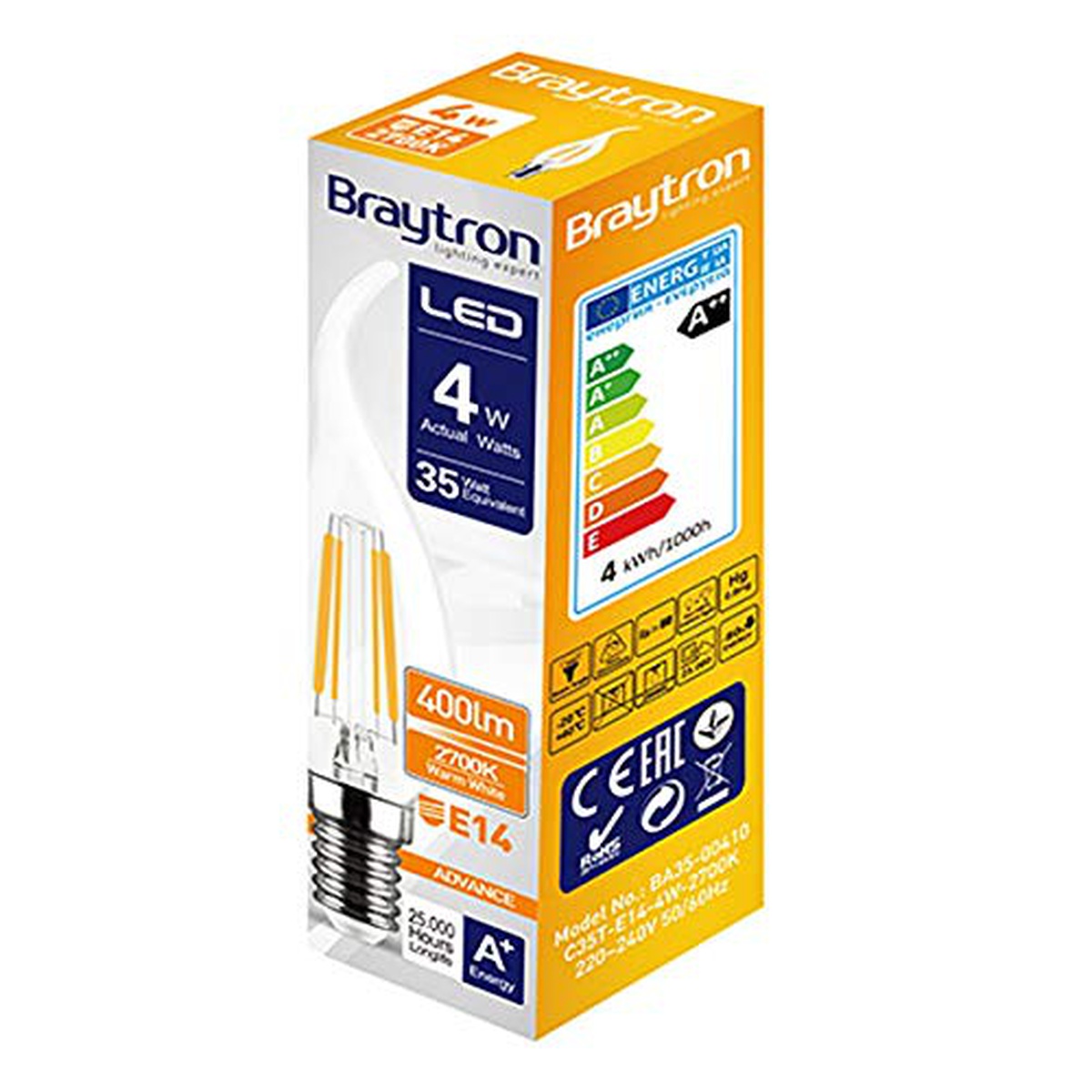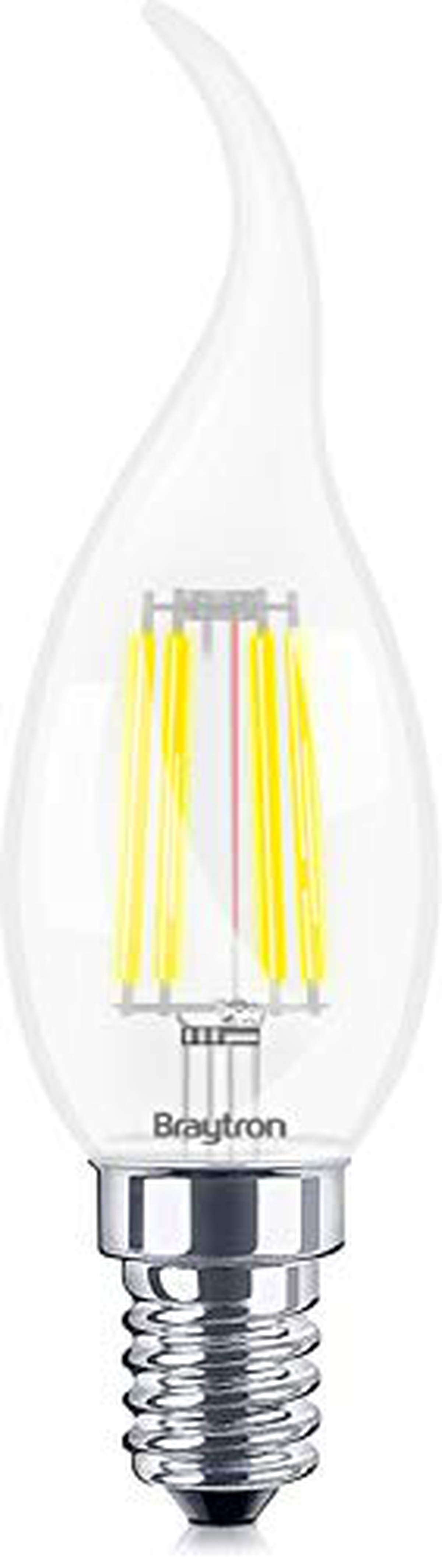 BRAYTRON LED Bulb, 4 W (equivalente 40 W) E14, 3000 K (bianco caldo), filamento, CRI ≥ 80, candela, CE Cerificated, (A++ classe Energy)