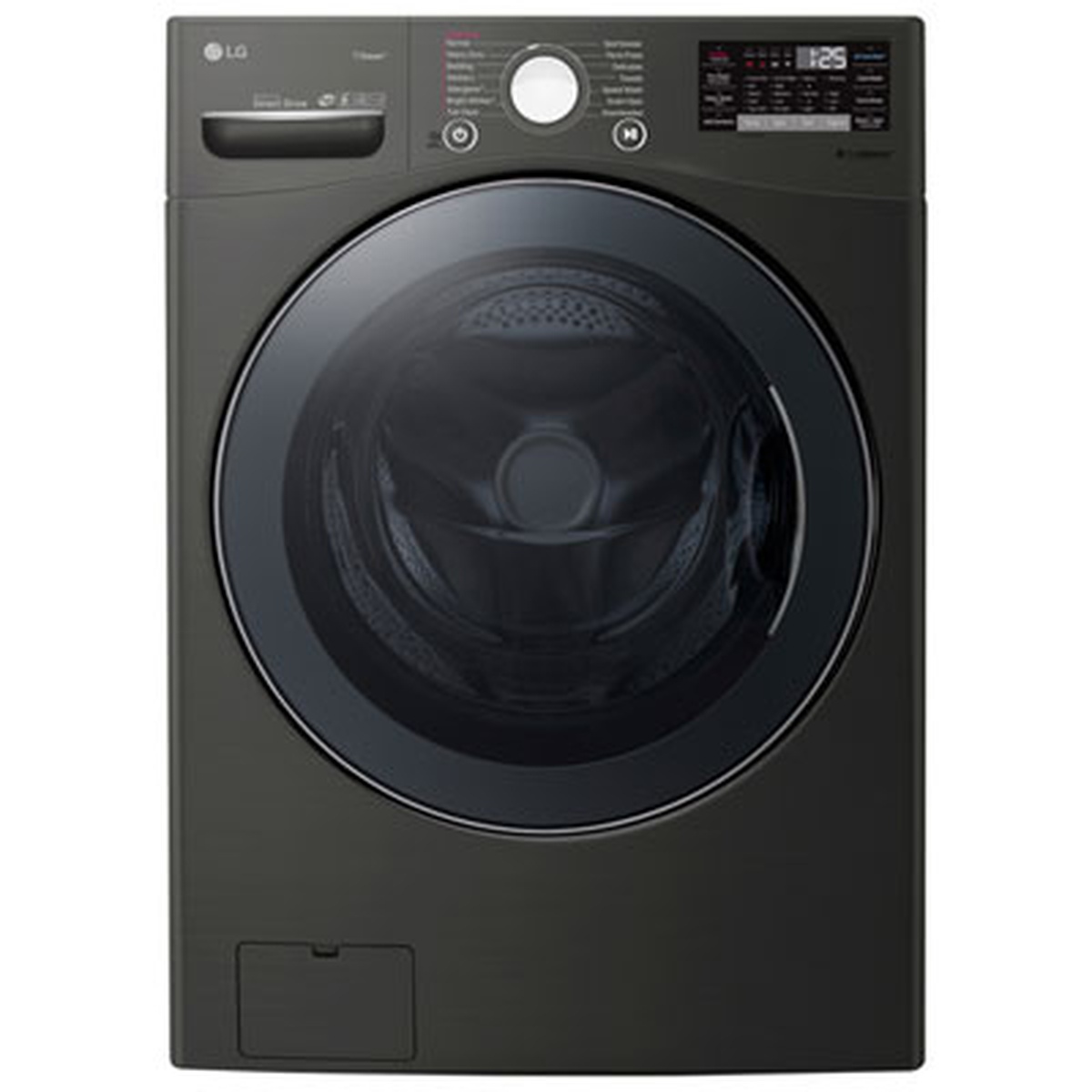 Get full use of the smallest laundry areas with the LG 5.2 cu. ft. TurboWash front-loading washer. This stackable unit is designed to sit underneath a matching dryer for vertical space-saving installation. This smart and efficient washer features 14 cycles to suit every load, TWINWash to handle two loads simultaneously, and steam technology for a deep clean. | LG 5.2 Cu. Ft. TurboWash Front Load Washer (WM3800HBA) - Black Steel