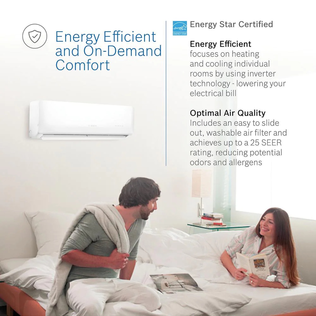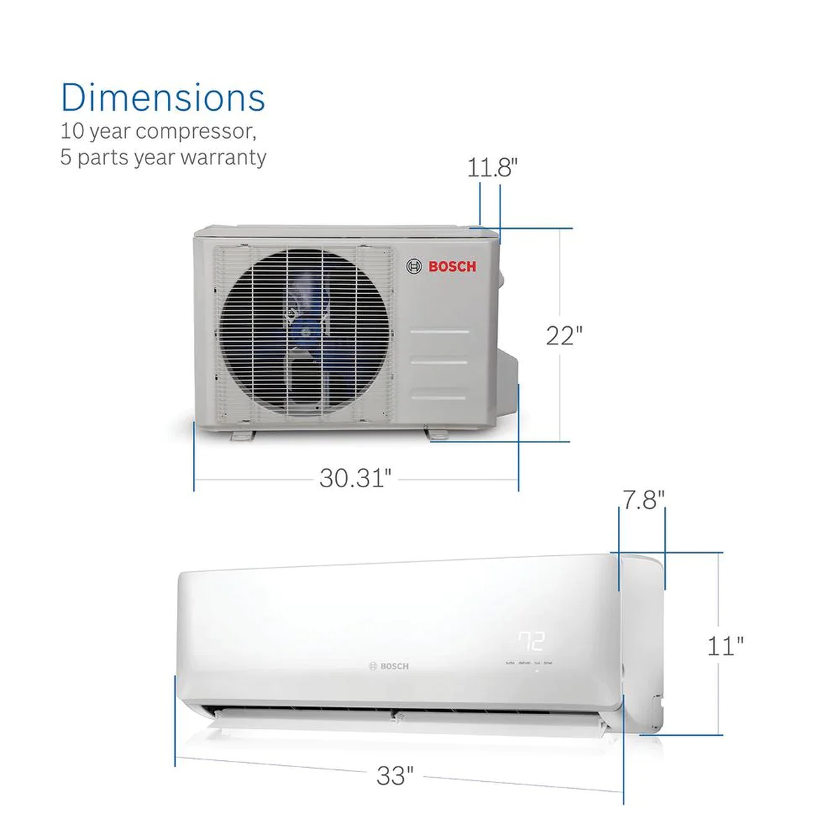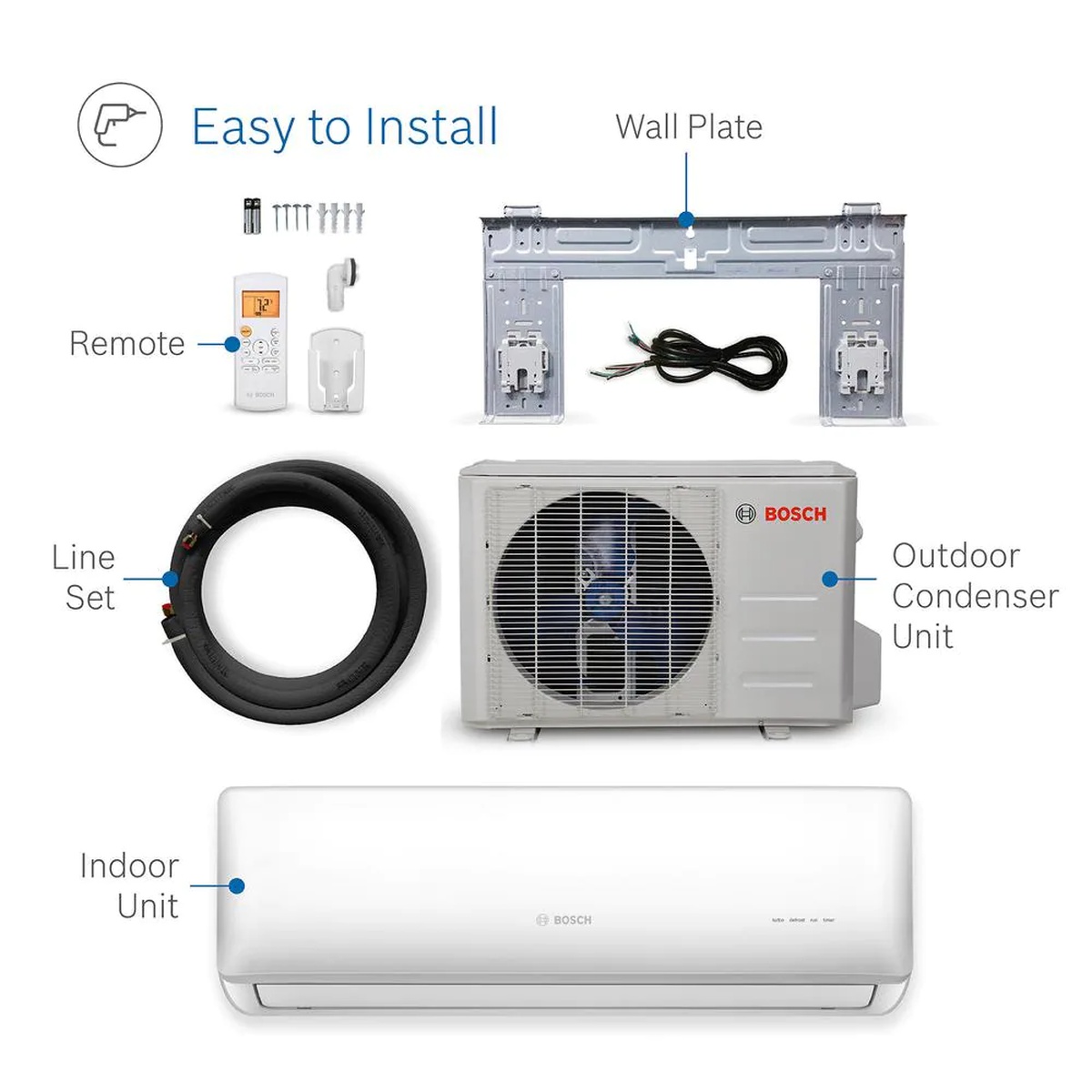 The Bosch Gen 2 Climate Ductless Mini Split Series provides energy-efficient, on-demand comfort that is flexible, simple to install and easy to maintain. An exceptional alternative to traditional HVAC systems, mini splits heat and cool individual rooms by utilizing a combination of efficient technologies to lower electricity usage and decrease your electric bill. The mini split system is ideal for spaces where ductwork will not fit or is overly costly including additions, renovations and enclosed patios. The system is comprised of 3-parts, the indoor air handler, an outdoor condensing section and the piping line set. The main units are connected by the electrical, refrigerant and condensate piping line set through a 3 in. Dia hole in an exterior wall. The outdoor unit is charged with enough refrigerant to charge up to 35 ft. of line set.