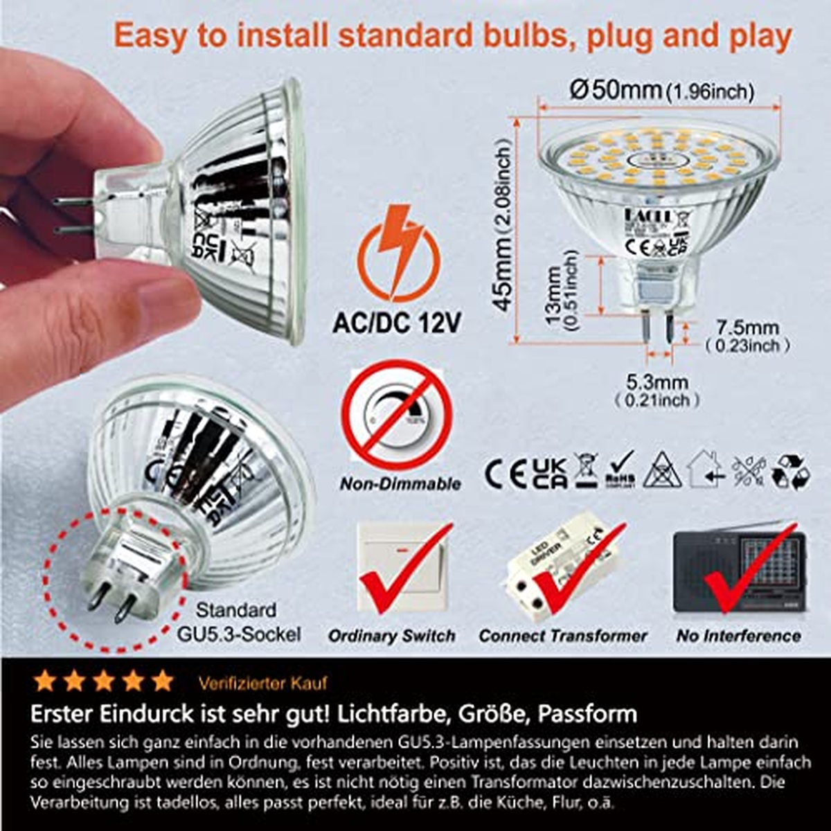 AC/DC 12V; Фtotal 595lm; GU5.3