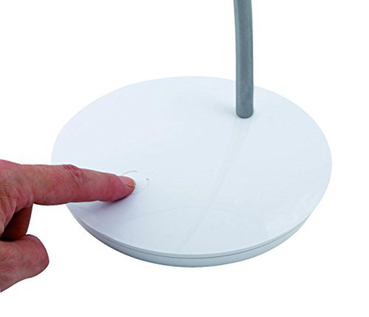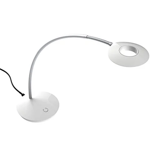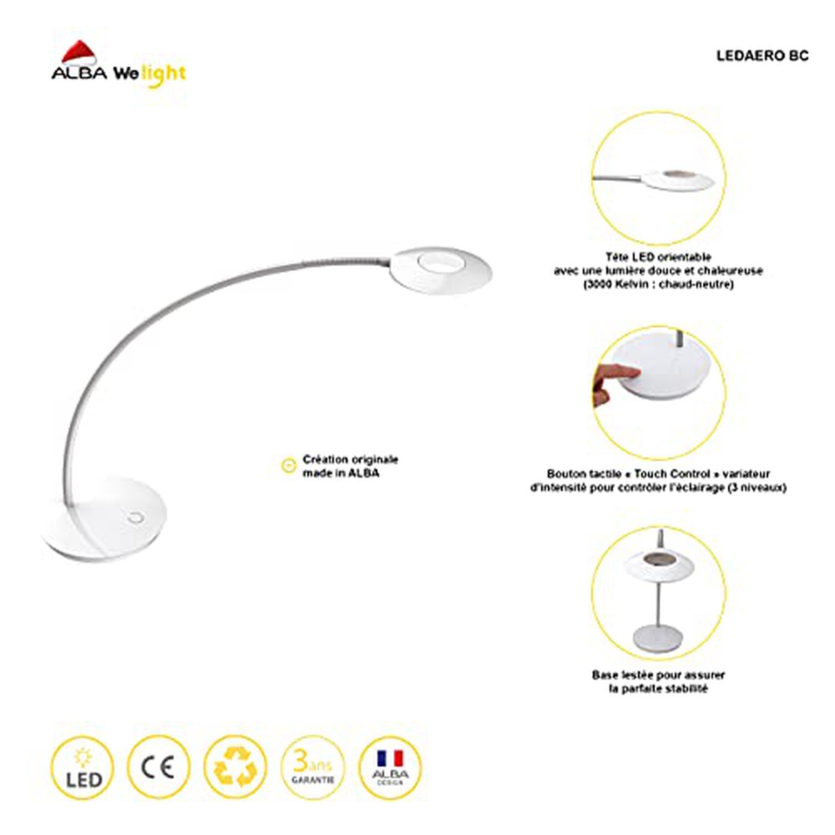Led intégré. Zone tactile sur base pour contrôle de l’éclairage (3 niveaux). Bras flexible et tête orientable. Base largeur 46 cm lestée avec patins antidérapants. Matière tête en aluminium et plastique 10 cm de diamètre, base en ABS, bras en acier longeur 46 cm.