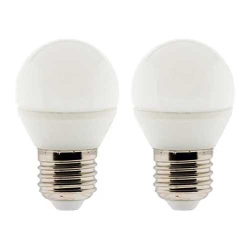 Lot de 2 ampoules LED Sphériques 5W E27 400lm 2700K (blanc chaud) La LED est un semi-conducteur qui émet de la lumière lorsqu'il est soumis à une stimulation électrique: le phénomène est appelé electroluminescence. Leurs flux lumineux élevés offrent de fantastiques qualités d'éclairage ainsi qu'une durée de vie très longue, tout en consommant très peu d'énergie. C'est la solution la plus adaptée à un environnement écoresponsable, comme les nouvelles constructions aux normes BBC ou RT2012. Caractéristiques: Culot: E14 Puissance consommée: 5W Puissance restituée: 35W Intensité lumineuse: 400 Lumens Température de la lumière: Blanc chaud (2700 Kelvin) Durée de vie: 15000 heures grâce à une qualité de fabrication supérieure. Consommation énergétique: classe A++.