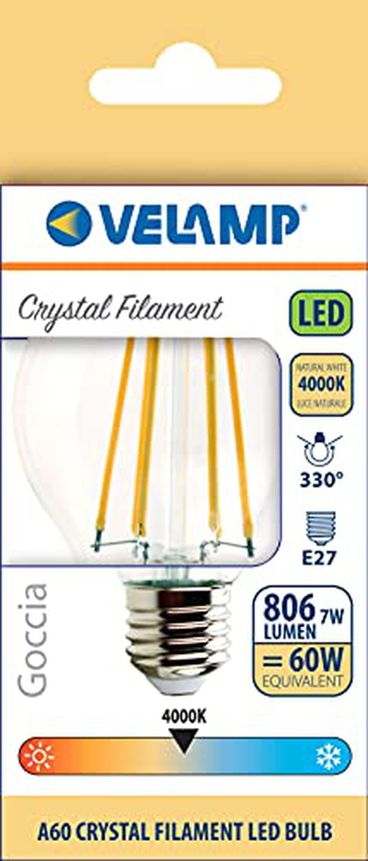 Velamp LB207C-40K, Lampadina LED a filamento, Goccia A60, 7W/806lm, base E27, 4000K
