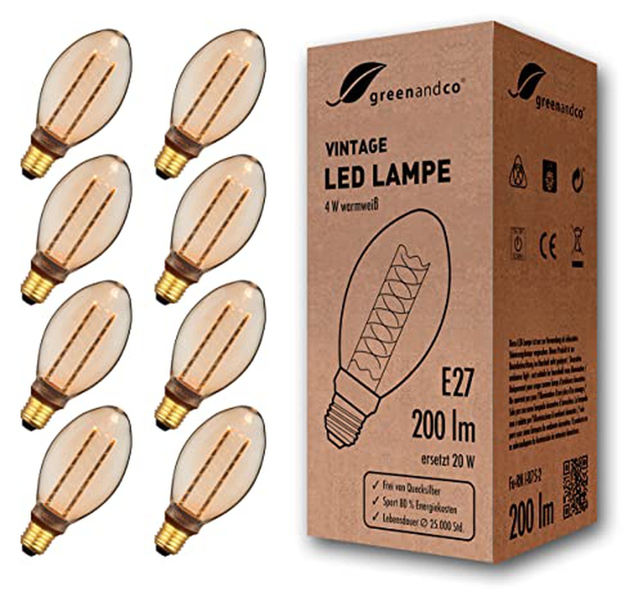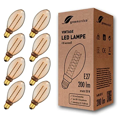 8x greenandco® lampadina a LED di design vintage in stile retrò per l'illuminazione d'atmosfera E27 B75 4W 200lm 1800K (bianco extra caldo) 320° 230V AC vetro, nessun sfarfallio, non dimmerabile