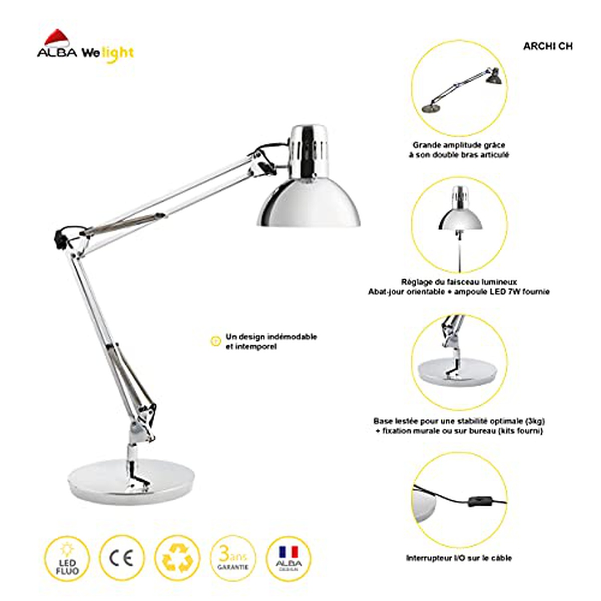 Lampada Fluorescente ALBA Archich Lampada da Scrivania per Casa e Ufficio Lampada Architetto con Base e Morsetto Cromata