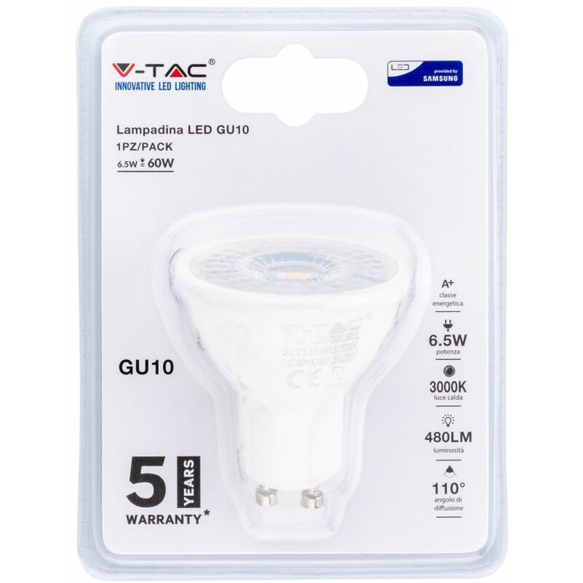 La lampadina V-TAC 2825 LED GU10 7W è una soluzione di illuminazione versatile ed efficiente dal punto di vista energetico. Con un'impressionante luminosità di 480 lumen, questa lampadina fornisce un'ampia illuminazione per qualsiasi stanza o spazio. La sua base GU10 garantisce una facile installazione e compatibilità con vari apparecchi. Dotata della più recente tecnologia LED, questa lampadina consuma solo 7 watt di potenza offrendo allo stesso tempo prestazioni eccezionali, rendendola una scelta ecologica che aiuta a ridurre il consumo di energia e ad abbassare le bollette elettriche. La lunga durata dei LED garantisce che non dovrai preoccuparti di sostituzioni frequenti. Questa lampadina non solo fornisce un'illuminazione brillante ed efficiente, ma vanta anche eccellenti capacità di resa cromatica. Illumina le stanze con una luce naturale e vibrante, migliorando l'atmosfera generale. Che tu abbia bisogno di un'illuminazione operativa o di un'illuminazione generale, questa lampadina offre versatilità per soddisfare le tue esigenze. Il design compatto del V-TAC 2825 LED GU10 lo rende adatto sia ad ambienti residenziali che commerciali. Usa queste lampadine in soggiorni, camere da letto, cucine, uffici, spazi commerciali o ovunque desideri un'illuminazione affidabile. Questa lampadina combina funzionalità ed estetica poiché il suo design elegante aggiunge un tocco moderno a qualsiasi spazio. La sua struttura resistente garantisce longevità anche in aree ad alto traffico o ambienti soggetti a vibrazioni. Aggiorna la tua attuale configurazione di illuminazione con la lampadina V-TAC 2825 LED GU10 da 7 W: un'opzione potente ma efficiente che soddisfa tutte le esigenze quando si tratta di prestazioni, risparmio energetico e stile!