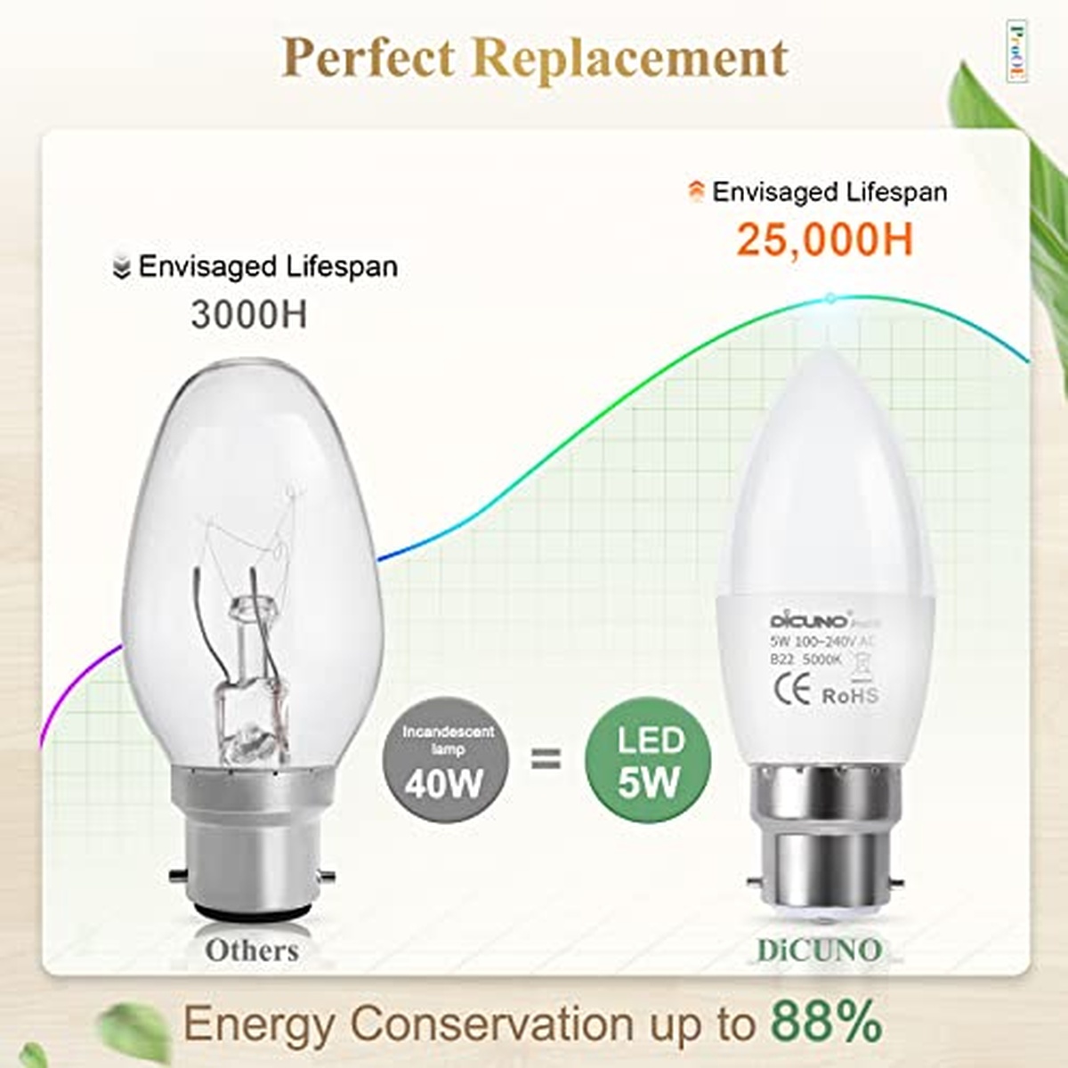 Denna ljusarmatur DiCUNO WV-FB-B22-C37-FS-DW LED 5W 410lm har en elegant design och energieffektiv prestanda. Med sin B22 bas är den enkel att installera i vilket standardljusuttag som helst. Den varma vita färgtemperaturen skapar en mysig atmosfär, perfekt för sovrum eller vardagsrum. Denna armatur är dimbar och producerar en ljusstyrka på 410 lumen, vilket gör den idealisk för arbetsbelysning eller allmän belysning. Den kompakta storleken och hållbara konstruktionen gör den lämplig för både bostäder och kommersiella applikationer.