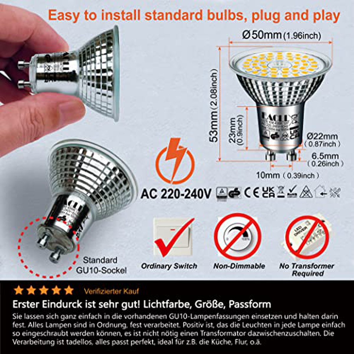 AC 230V, 50Hz; GU10; Фtotal 1300lm